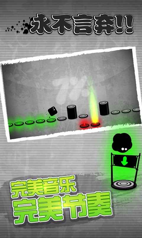 采用的操作方式非常简单,一根手指头便可完成整个游戏操作,点击屏幕任意位置即可跳跃。这样就小瞧它了?那可就太天真了,连续跳跃、停顿跳跃、躲避跳跃,多种形式地跳跃与游戏节奏十分协调,因此对于点击跳跃方判定十分精确,在考验敏捷度的同时还要对乐感进行考究,可不是一般人能duang住的了。