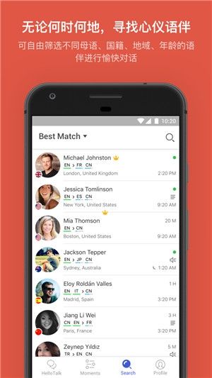 《HelloTalk》是最好的外语学习方法,就是直接和外国人对话。如果你在学习英语,最好是能找到母语是英语,但同时在学习中文的朋友。HelloTalk 是为了协助你找到语言学习伙伴而诞生的一款社交应用,语言学习爱好者,还在等什么呢?赶快去和全世界的语言学习伙伴打招呼吧!