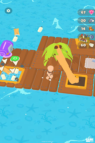 最初资源有限,需要利用钩爪获取资源,有时候还能看到各种小岛屿,利用船锚使木筏停下来,建造一把斧