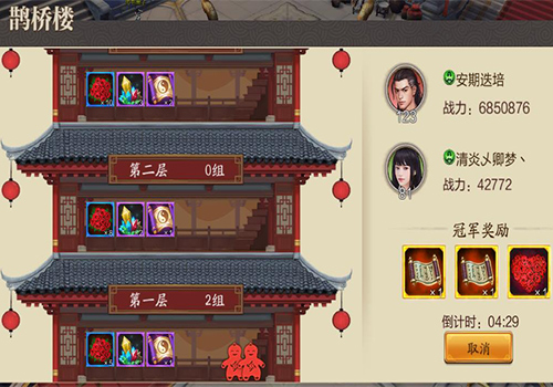 俗话说,夫妻同心,其利断金,鹊桥楼活动就是专门为游戏中有夫妻关系的玩家开启的PVP竞技活动。简单来说,鹊桥楼活动类似于爬塔,最终层数由报名玩家数量决定。活动开始时,所有玩家都在第一层,以组为单位随机两两匹配进行战斗,胜者上一层,败者原地停留,最终成功登顶鹊桥楼的玩家组获胜。每场战斗中,场地中央会有几个供玩家抢夺的、有助于战斗增益的道具,其中一个是同心结,获得之后开始计算积分,击杀对方持有同心结的玩家可将同心结抢夺过来。闯鹊桥楼就有奖可拿,冠军组还会获得为期一周的夫妻专属称号和999朵玫瑰花。检验夫妻实力与默契度的时刻到了,仙侣们准备好了吗?