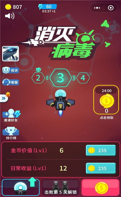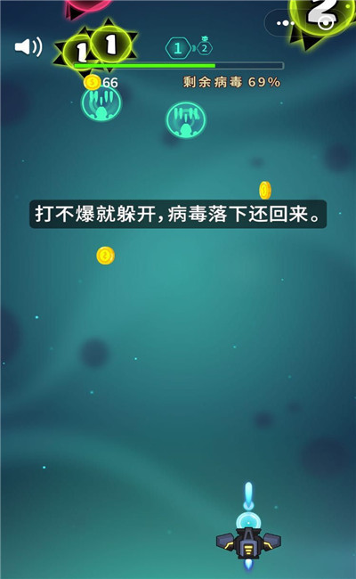 玩家前期遇到的病毒很弱小,很容易消灭,尽可能的消灭所有的病毒,不要放过任何一个,这样可以获得一定的收益,前期可以升级几次武器,可以提高攻击效率,然后就攒钱购买更加强大的武器,比升级划算很多,而且面对越来越强的病毒也会更加轻松,把握好升级和攒钱的时机很重要。