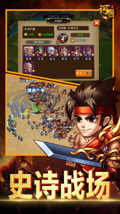 3、组建自己庞大的队伍吧,阵容的搭配在你与敌人厮杀的时候尤其重要! 游戏非常精美的画面会给与玩家们最为有趣的战斗体验,每一位武将的精心刻画将它们的神韵都提现的淋漓尽致,统帅千军万马进行战斗会给你带来非常刺激的热血体验,策略式的回合战斗不再让你感受枯燥乏味的自动秒杀,拿出你真正的实力来吧!