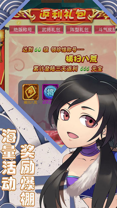 萌系挂机策略游戏,超爽福利等你来拿~七天连续登陆送极品神装/金品质神将,海量元宝、铜币、升阶材料每日让你爽翻天!
