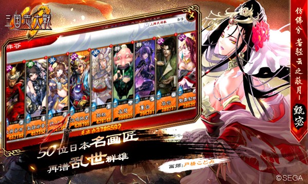 在版权方的助力下,《三国志大战M》邀请到狮子猿、三好载克、陆原一树等日本顶级画师加盟,游戏中400多张人物卡牌立绘均出自大师之手,每一张都极具收藏价值。刘关张、诸葛孔明、曹操、吕布等玩家耳熟能详的名将都将在游戏中重返战场,为你的统一大业鞠躬尽瘁!