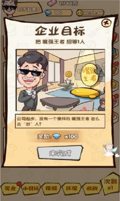 游戏中的人物角色均为各种各样搞笑幽默的动画人物,你需要均衡职工与老总的关联,职工造成盈利,老总耗费盈利征募大量职工。动画场景为充满了快乐气场的工作环境,每一个角色都是有各有的运行状态。