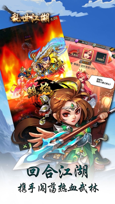 《乱世江湖》是一款采用最新游戏引擎打造的一款集闯关、养成、策略、奇遇、对战等多种玩法于一身,满足玩家对武侠世界向往的精品手游。多样休闲玩法丰富游戏体验,江湖游历、千里行镖,更多武侠内容一应俱全,演绎不一样的江湖恩怨,并且创新性将竞技与回合融合在一起。游戏中加入豪侠榜、天香阁、攻城略地等强势竞技系统,还有丰富的开服活动,强力装备,金色侠客,海量元宝道具限时获取,与全球千万玩家一起战斗!