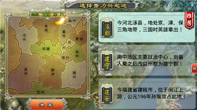 开始进入游戏的时候有三个势力地可以选择,大家都知道刘备就是幽州涿郡涿县人士,所以系统推荐的是涿郡。