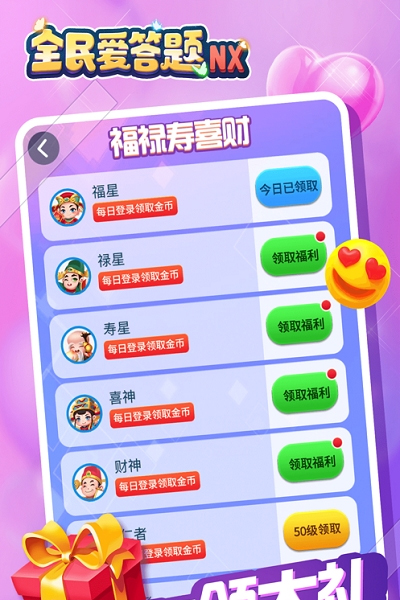 《全民爱答题NX游戏》这款休闲答题赚红包的游戏!超级多的问题,多样性创新的答案,有趣的赚红包!不断对战自我,做答案之王,快速收获满满的红包福利,永久的红包收入等着你拿!你还可以按照回答问题获得大礼,各种各样的神仙都来送礼。题库是超级多种多样,男女老少都能比较容易突破!