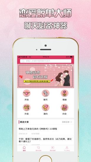 《神撩话术》是一款移动恋爱助手,恋爱脱单神器,恋爱情感知识分享的软件平台,致力于解决所有单身男士的情感问题。