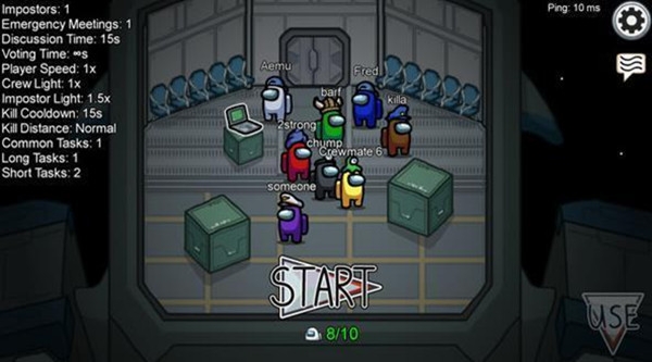 游戏场景发生在一艘太空船上,游戏分为两个阵营。船员阵营(好人)和冒充者(狼人)
