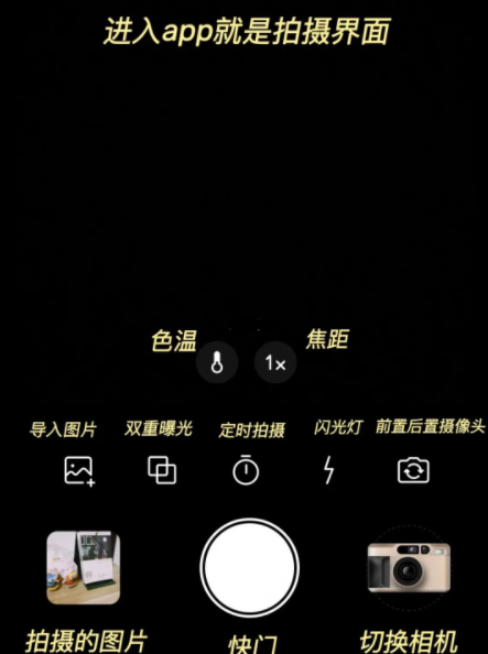 从左到右:导入图片,专治日常随手拍的废片;双重曝光,依次拍摄或导入两张图就可以get双重曝光得到的图片;延时拍摄,分别有3秒和10秒的延时;闪光灯;前置后置摄影头切换。