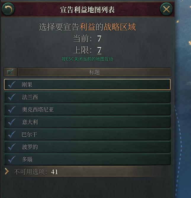 如果缺少了利益,玩家需要在外交中对想要殖民的区域宣告利益。此外需要注意的是,宣告利益后不能立即发动殖民,必须等待至少两周后才能发动殖民。