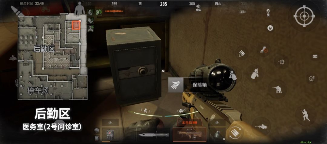 医务室位于后勤区的东北侧,会刷新一些医疗物资,如果在战局内药品耗尽可以尝试来这里补充。里面的二号问诊室需要钥匙打开,有一个保险箱,所以这里也是很多先锋喜欢光顾的热门地点。占领医务室之后也可以凭借地形控制从医务室到右侧办公区的电梯走廊,是个比较常规的架枪点位。