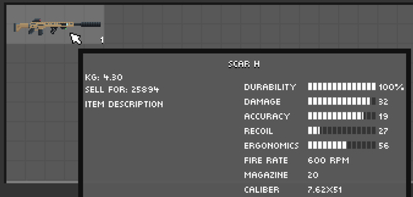 这把枪非常的不好用,其使用7.62*51子弹,伤害属于中间威力,击杀通常怪物需要两发,而其弹匣狭小,作为自动步枪非常糟糕,还会和正经狙击枪抢子弹,要开镜不如m1a,要自动不如akm,没有任何优势,不建议使用。