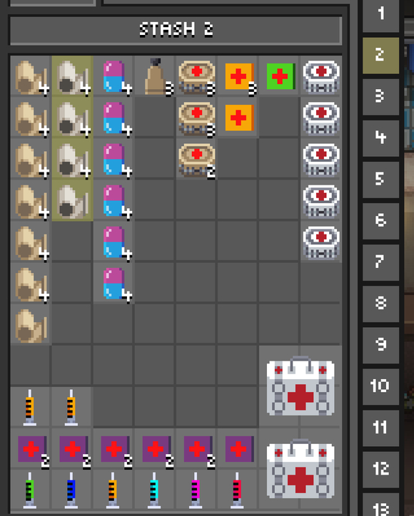 黄色绷带止血,白色绷带回复15HP,药丸减辐射,棕色止血凝胶,黄色医疗包回50HP,橙色针盒回40HP,绿色针盒回60HP并止血,紫色针盒回100HP并止血,白色医疗箱修复血量上限,大白医疗箱修复大血量上限。
